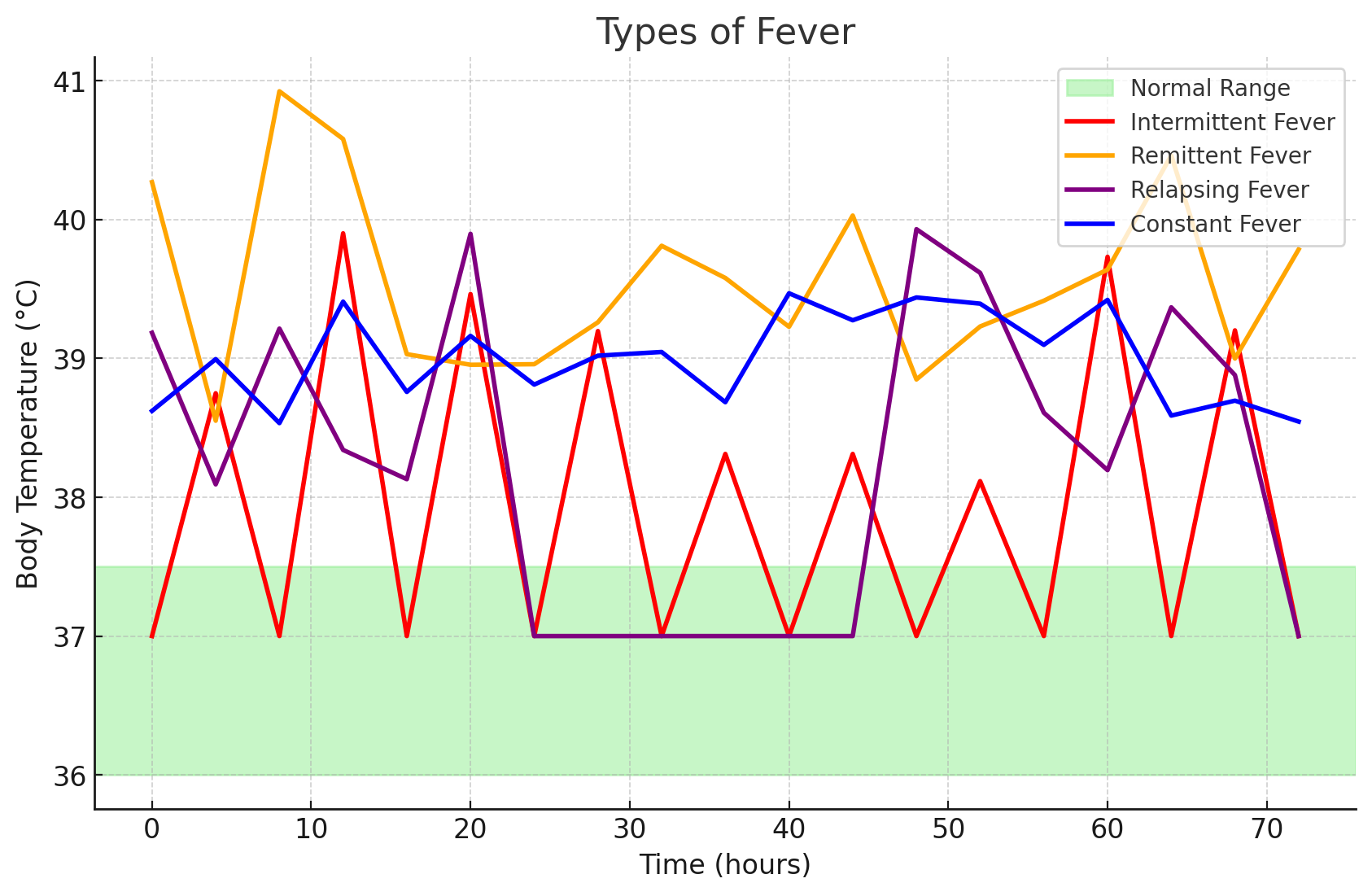 Remittent Fever: a fever that maintains a high temperature with wide fluctuations (>2°C) over 24 hours.