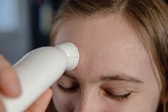 | Temporal Temperature | Surface; Same as core temperature. | Safe and noninvasive; very fast. May utilize a patch, chemical thermometer, or temporal artery thermometer. This is useful for infants and children. - Requires electronic equipment that may be expensive or unavailable. Variation in technique needed (forehead-temple) if the client has perspiration on the forehead. | Brush hair aside if covering the temporal artery area. The probe is placed flush midline on the forehead and slowly slid to the hairline, not down the side of the face, then touch it on the neck just behind the earlobe.![]() |