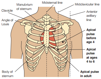 | Apical | 8 centimeters left of the sternum at the fifth intercostal space* | Routinely used for infants and children up to 3 years of age. Used to determine discrepancies with radial nurse Used in conjunction with some medications |
