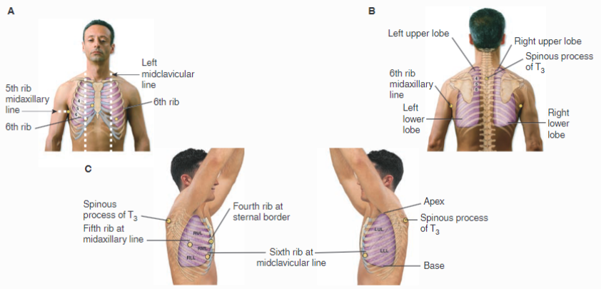 Chest landmarks are imperative for assessment. These include a series of imaginary lines on the chest wall and positions of ribs and spinous processes. These landmarks help to identify the position of underlying organs (e.g., lobes of the lung) and to record abnormal assessment findings. The chest wall is also divided into three regions: anterior, lateral, and posterior. The anterior chest wall includes the following items listed #1–3, the lateral chest walls include #3–5, and the posterior chest wall includes #6–8.