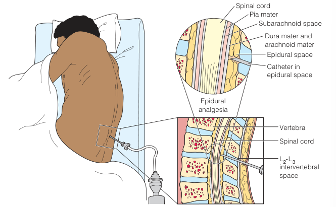 The anesthesiologist or nurse anesthetist inserts a needle into the intrathecal or epidural space (typically in the lumbar region) and threads a catheter through the needle to the desired level. The catheter is connected to tubing that is then positioned along the spine and over the client’s shoulder for the nurse to access. The entire catheter and tubing are taped securely to prevent dislodgment. Often an occlusive, transparent dressing is placed over the insertion site for easy identification of catheter displacement or local inflammation.