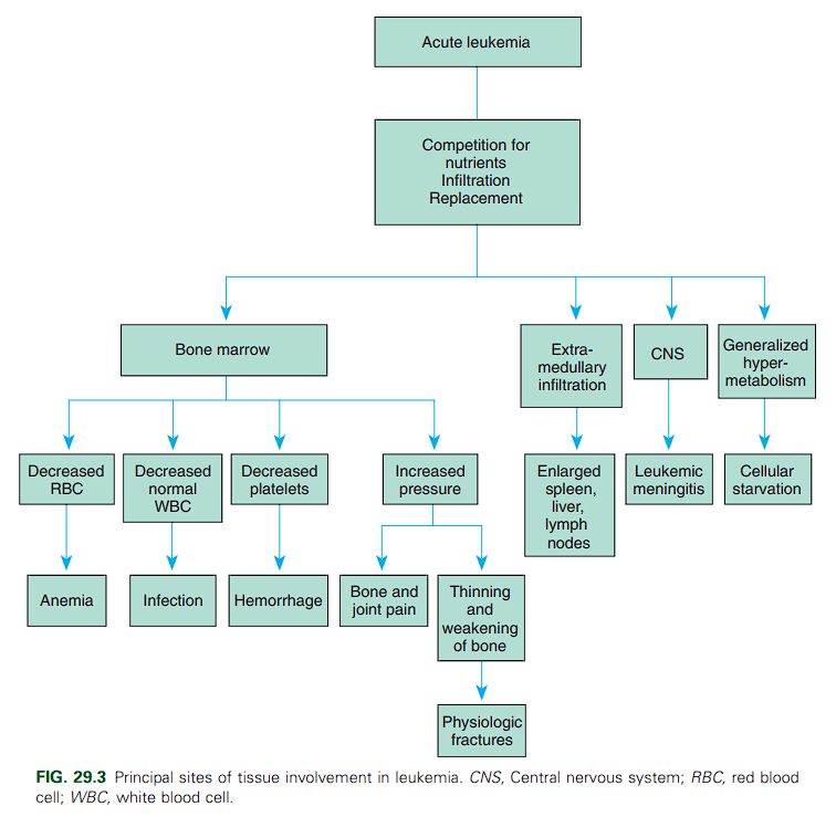 The onset of leukemia varies from acute to insidious. In most instances the child displays remarkably few symptoms. Signs and symptoms of ALL reflect infiltration of the bone marrow by nonfunctional leukemic cells (“blasts”). The three main consequences of bone marrow infiltration are: