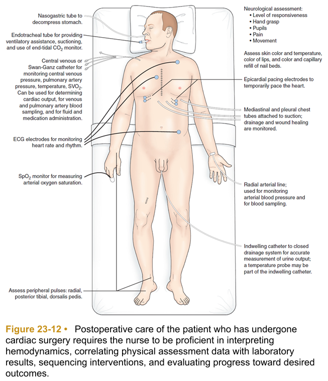 Initial postoperative care focuses on achieving or maintaining hemodynamic stability and recovery from general anesthesia. Care may be provided in the post-anesthesia care unit (PACU) or ICU. The immediate postoperative period for the patient who has undergone cardiac surgery presents many challenges to the health care team. All efforts are made to facilitate the transition from the operating room to the ICU or PACU with minimal risk. Specific information about the surgical procedure and important factors about postoperative management are communicated by the surgical team and anesthesia personnel to the critical care or PACU nurse, who then assumes responsibility for the patient’s care. After the patient’s cardiac status and respiratory status are stable, the patient is transferred to a surgical progressive care unit with telemetry. Care in both the ICU and progressive care unit focuses on monitoring of cardiopulmonary status, pain management, wound care, progressive activity, and nutrition. Education about medications and risk factor modification is emphasized.