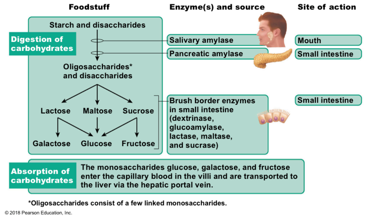 Carbohydrates that come in the form of starch, polysaccharides, and disaccharides are broken down into smaller forms via the mouth’s salivary amylase, the pancreas’ pancreatic amylase, and various brush border enzymes in the small intestines (Dextrinase, Glucoamylase, Lactase, Maltase, Sucrase).