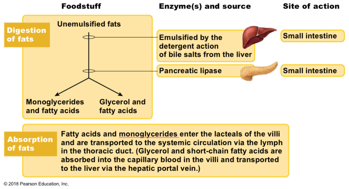 Fats are emulsified by the detergent action of bile salts from the liver, which allows them to be acted upon by pancreatic lipase. This converts fats into monoglycerides, glycerol, and fatty acids. Fatty acids and monoglycerides enter the lacteals of the villi and then enter systemic circulation via the lymph in the thoracic duct. Glycerol and short-chain fatty acids are absorbed into the capillary blood in the villi and are transported to the liver via the hepatic portal vein.