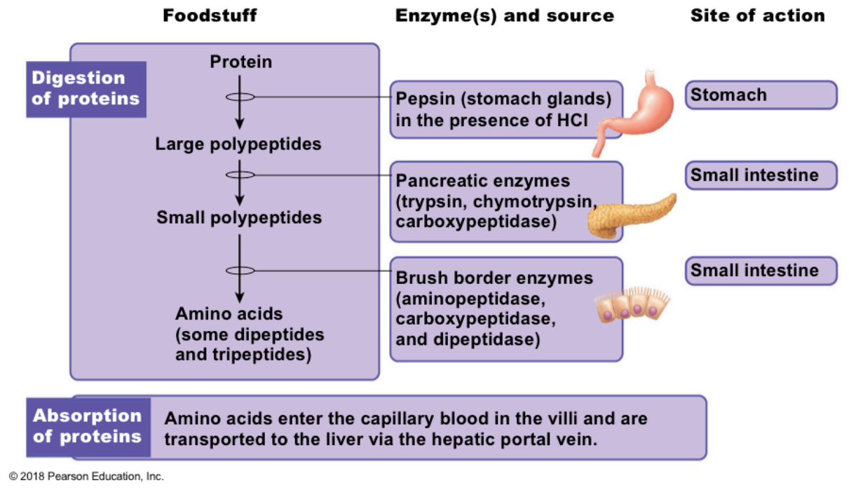 Protein is broken down starting from the stomach, where pepsin is produced by chief cells, breaking protein down into large polypeptides. The pancreas further contribute trypsin, chymotrypsin, and carboxypeptidase to break down large poly peptides to smaller polypeptides. These are finally converted into amino acids (and some di/tripeptides) in the small intestine by various enzymes (aminopeptidase, carboxypeptidase, dipeptidase).