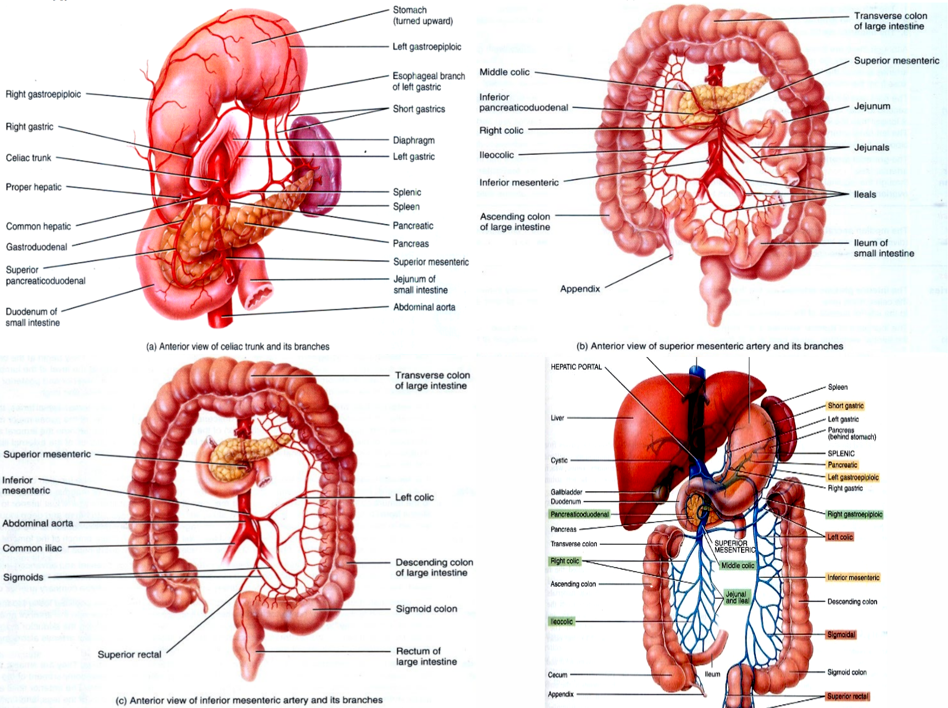 The GIT receives blood from arteries along the length of the thoracic and abdominal aorta. For drainage, the portal venous system utilizes five large veins: superior and inferior mesenteric, gastric, splenic, and cystic veins. These all form into the vena portae that enter the liver which then distribute it to the various hepatic veins that terminate in the inferior vena cava.