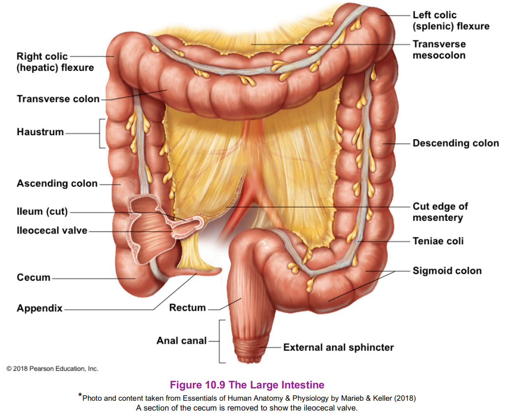 Starting from the ileocecal valve (cecum) to the anus, it is shorter than the small intestines at ~1.5m long, but is larger in diameter. The large intestines are also held in place by the mesentery. The large intestines are responsible for fluid and electrolyte absorption, vitamin production and absorption, and excretion. The breakdown of waste products is majorly influenced by the colon’s gut microbes, especially in undigested or unabsorbed proteins and bile salts.