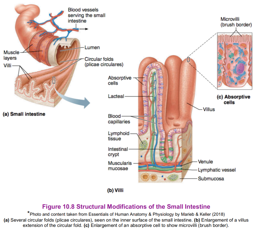 - The small intestines have an increased surface area for food absorption. This is achieved with the villus, microvillus structures and plicae circulares (circular folds). These are numerous at the start of the small intestines but decrease in number by the end small intestine.