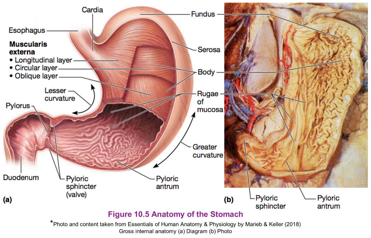 The stomach is a C-shaped organ on the midline and left side of the abdominal cavity. It serves as a temporary storage tank for food being able to contain ~1.5L, and where carbohydrate digestion continues. Protein digestion also begins. The stomach converts bolus into chyme, taking in food from the cardioesophageal sphincter (gastroesophageal junction) and releasing it into the small intestines through the pyloric sphincter.
