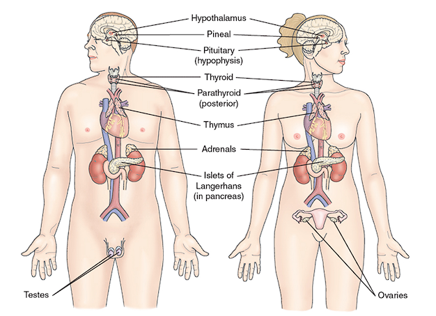 - Glands: the secretory tissues of the endocrine system, most often being released directly into the blood streams; the pituitary gland, thyroid gland, parathyroid glands, adrenal glands, pancreatic islets, ovaries, and testes. There are also exocrine glands such as sweat glands that secrete products onto epithelial surfaces or the GI tract.