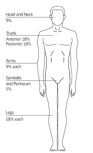 - Rule of Nines: the most common method of estimating the extent of burns in adults is the rule of nines. Be critical in determining percentages: presentations may involve only the anterior portion of a body part—this would halve the body part’s respective percentage. For example, the “anterior chest” would be ~9% as the anterior trunk is divided between the chest and the abdomen; “a circumferential burn of the left upper arm” would be approximately 4.5%, as it involves both the front and back of the upper arm.