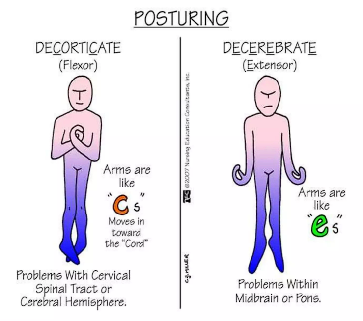 Individuals with severely injury may experience decorticate or decerebrate posturing: